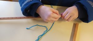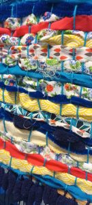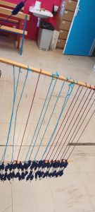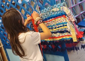 Depuis les vacances de février les petites mains de la garderie ont fait preuve d’habileté et de patience pour ourdir notre métier à tisser, déchirer en bandes les chutes de tissus offertes par une maman, puis garnir en tissant toutes ces bandes.