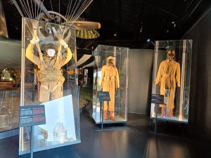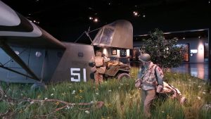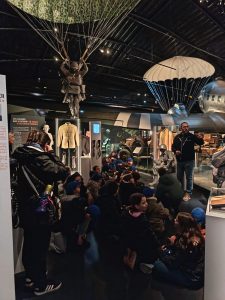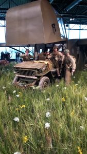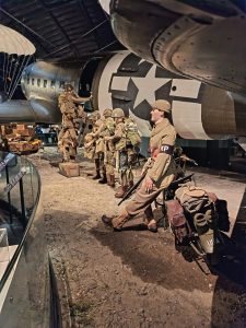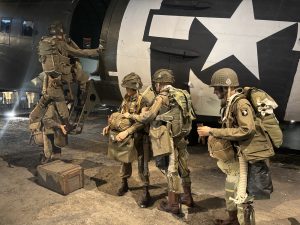 La visite guidée était très intéressante. Nous avons vu un C47 authentique qui a servi au transport de troupes parachutistes, mais aussi un planeur WACO, qui lui présentait l’avantage de pouvoir transporter quelques soldats et du matériel (jeep, petit canon, mini bulldozer) en les faisant atterrir n’importe où, silencieusement.